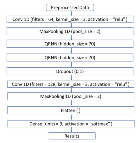 The parameters of the hybrid model were obtained during the training phase by trial and error including the number of CNN filters, the number of QRNN hidden units, and the dropout rate. As mentioned in different studies [35], kernel size values of 3 and 5 are the most common, so we used kernel size 3 with both datasets in our experiment. A filter can help in extracting more details from a dataset by increasing the number of filters [51]. Thus, for the first CNN layer, we used 64 filters, and for the other CNN, we used 128 filters. Additionally, we set the value of the batch size for the training at 128 and the value of the number of epochs at 10. The details and the selected parameters of the hybrid DL model are presented in Figure 3.