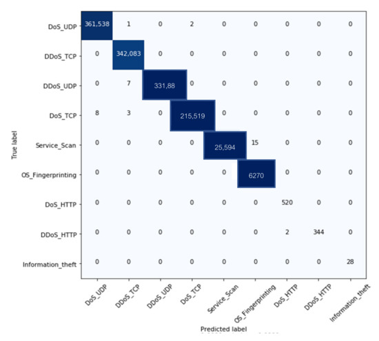 In previous studies, different datasets, such as KDD99, ISCX, and CICIDS2017, have been used to evaluate ML models; however, few datasets have been produced to reflect realistic IoT network traffic. These datasets were either not diverse enough in terms of attacks or not realistic in terms of the testbed [19]. Therefore, Koroniotis et al. [49] designed the BoT-IoT dataset to address these limitations. The BoT-IoT dataset is used in forensic analysis and to evaluate IDS. The dataset contains normal IoT traffic and different types of attack traffic with subcategories for each type, which are listed in Table 2. Reconnaissance is one of the privacy threats, and it allows a threat actor to collect data about a victim via port scanning and OS fingerprinting, among other ways. Information theft includes data theft by unauthorized access and keylogging. On the other hand, a DoS threat affects the availability of services and can damage systems, which make it one of the biggest threats to smart cities. In this dataset, UDP, TCP, and HTTP protocols were used to perform both DoS and DDoS attacks.