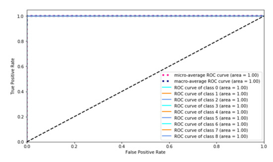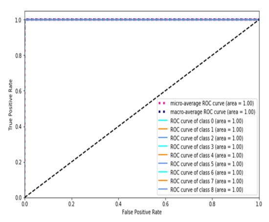 Figure 6 presents the confusion matrix of our proposed model on the TON_IoT dataset, and the ROC curve is presented in Figure 7. Both ROC curves show that our proposed model achieved the highest value of 1. Thus, our proposed model performed very well with all the classes.