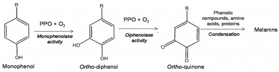 - Espín, J.C.; García-Ruiz, P.A.; Tudela, J.; Varón, R.; García-Cánovas, F. Monophenolase and Diphenolase Reaction Mechanisms of Apple and Pear Polyphenol Oxidases. J. Agric. Food Chem. 1998, 46, 2968–2975. [Google Scholar] [CrossRef]