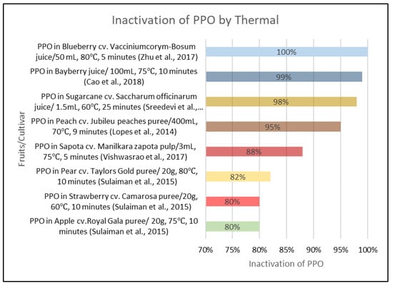 - Silva, F.V.M.; Sulaiman, A. Polyphenoloxidase in Fruit and Vegetables: Inactivation by Thermal and Non-Thermal Processes. In Encyclopedia of Food Chemistry; Elsevier: Amsterdam, The Netherlands, 2019; ISBN 9780128140451. [Google Scholar]
