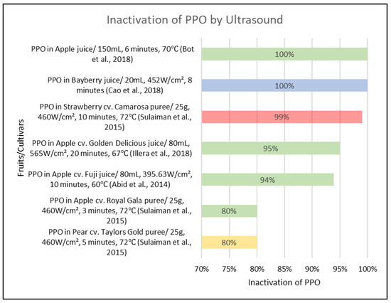 - Cao, X.; Cai, C.; Wang, Y.; Zheng, X. The inactivation kinetics of polyphenol oxidase and peroxidase in bayberry juice during thermal and ultrasound treatments. Innov. Food Sci. Emerg. Technol. 2018, 45, 169–178. [Google Scholar] [CrossRef]