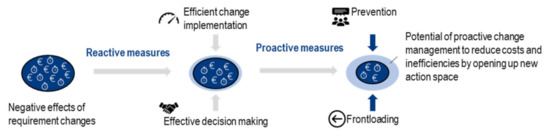 Proactive management of requirement changes can open up this action space and reduce the negative effects by considering the phase before a formal change request (cf. Figure 1). Major action strategies are change prevention [20] and frontloading in order to reduce the change impact [22,23].