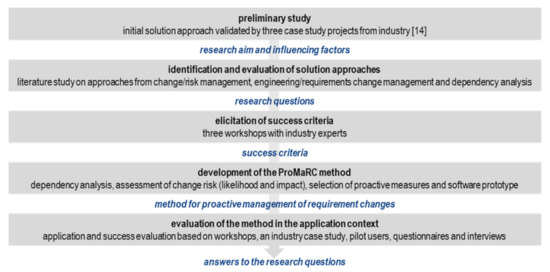 The research approach to develop a method for the proactive management of requirement changes is based on the research process for applied science according to ULRICH [41]. The process was selected, because it is suggested especially for research questions requiring industry feedback parallel to all research steps. Thereby it ensures practical relevance of the solution. This is a difference to other methodologies (for instance [42,43,44,45]), which give flexibility to do so, but do not encourage integration of industry to such extent. Additionally, ULRICH’s approach provides a flow logic which is suitable for bounded research projects (e.g., PhD projects), whereas other methodologies better suit extensive endeavors. ULRICH defines a flow logic without explicit support for the implementation of the individual steps. For this reason, elements of the Design Research Methodology (DRM) according to BLESSING and CHAKRABARTI [46] were used as a supplement. The DRM offers comprehensive support for the conceptual design and implementation of research phases and is structurally compatible with ULRICH’s flow logic. In contrast to other methodologies, the DRM focuses on exploring new solution approaches to support design research in the technical area, so that frameworks and conventions of the given context of this research were considered. Specifically, the evaluation concept was used: support evaluation in parallel to the development, followed by an applicability and success evaluation after the development.
