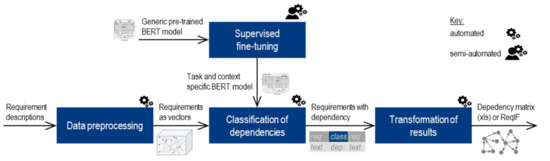 Precision, Recall and F1 values of BERT are good in terms of a multi-class classification problem and ROC_AUC is close to the optimum. Therefore, BERT is used for dependency analysis (cf. Figure 3). Before dependency analysis itself can be conducted, data preprocessing is required to transform requirement data into the required form (vectors). Then, classification of requirement dependencies is implemented by means of a BERT model. The model is based on a generic pretrained model and fine-tuned for the intended task. As a last step, the dependency data are transformed into common data formats (for instance, csv files) for further usage.