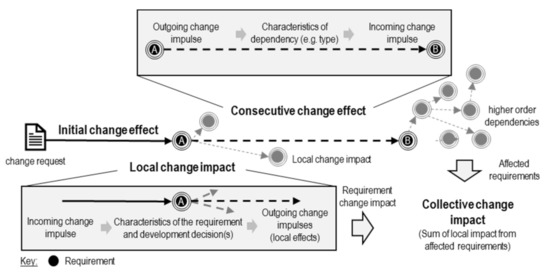 For requirement change impact assessment, the influencing factors need to be differentiated (cf. Figure 4). The starting point is an initial change request from an exogenous change initiator (for instance, a customer). Implementing this change leads to an impact directly associated with changing the affected requirement (local change impact), but also sends out subsequent change impulses to other requirements (consecutive change effects). Those exist due to requirement dependencies and need to be implemented to ensure consistency and validity of the requirement set. Usually, changes caused by consecutive effects are referred to as change propagation [5,7,9]. By adding up the local change impact of all requirements on a propagation path, the collective change impact of the initial change request can be assessed [55].