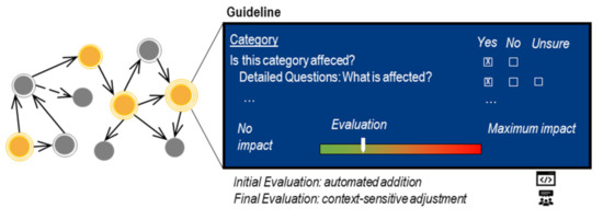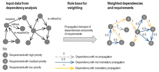 Depending on the company-specific prioritization scheme, weighting factors can be defined. Since many prioritization schemes follow a threefold structure (for instance, enthusiasm characteristic, performance characteristic and basic characteristic) [61], a differentiation into high (weighting = 3), medium (weighting = 2) and low priority (weighting = 1) is used as an example. The result of this step is weighted nodes in the requirement network as an indicator for local effects of a change.