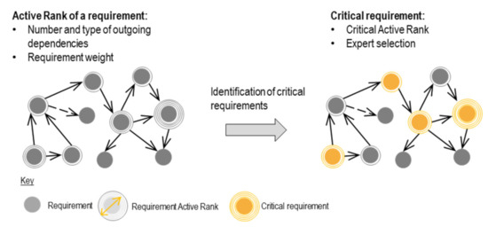 The weighted requirement network is evaluated automatically regarding expected change impact. Critical requirements are selected. Evaluation of the requirement network is based on the PageRank algorithm [55] (based on [62,63]). Context-specific adaptation of the original PageRank algorithm is required to account for the weighting of dependencies and requirement as well as the direction of dependencies. For impact analysis, only the outgoing dependencies of a requirement are relevant, since only such dependencies can be used for change propagation.