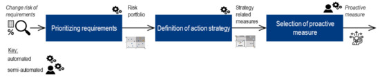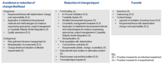Proactive Measures to manage the requirements’ change risk are introduced by risk management literature in the first place. They can be structured by category (avoidance, transfer, reduction and acceptance [27]) and aim to reduce the likelihood or impact of a potential requirement change. Existing approaches provide methods for individual elaboration of appropriate measures (for example, creativity techniques such as brainstorming [38] or Six Sigma DMAIC cycle [28]) or list generic risk measures (for instance [27,39,40]). Neither a support to select appropriate measure based on the present requirement risk characteristics nor an overview of context specific risk measures for requirement changes are given.