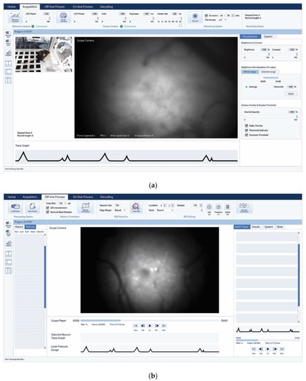 Although various O-BMI systems based on calcium images have been developed and commercialized, it has been reported that the UI designs of the existing O-BMI systems require improvement in terms of convenience and usability. Existing O-BMI systems have been developed by applying new technologies such as deep learning techniques and online image processing algorithms to calcium image data [10,11]. For example, Friedrich et al. (2020) proposed an algorithm to extract neuronal activities in real-time from microendoscopy using the convolutional neural network (CNN) method, which can achieve high-quality results produced by popular offline approaches such as extended constrained non-negative matrix factorization (CNMF-E) [10,12]. However, Cui et al. (2019) identified user needs such as information visualization, intuitive control, and layout optimization by conducting a focus group interview with five experts who had prior experience with O-BMI systems (Miniscope, nVista, and Mosaic) [13]. Additionally, Spiegel et al. (2016) proposed that new functions such as the integrated real-time data processing of feature extraction, neural coding, and feedback control would improve the effectiveness of an O-BMI system [14].