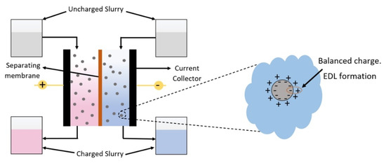 The design of the EFC cell is critically important to facilitate the FEs (i.e., mitigate clogging) and maximize system performance. A reduction in ohmic losses can be achieved by using shallow channel geometry and supporting the free passage of the FEs without clogging. The design of EFC is also dependent on the properties of the FEs used for capacitive storage. In particular, the concentration of electrode particles, particle size/shape, and carrier-fluid (electrolyte) viscosity have a significant effect on the performance of the FEs and can be altered to obtain improvements in rheological and electrochemical properties for enhanced slurry flow and EFC performance [6]. The charge is stored by forming an electric double layer at the interface of the highly porous electrode and the surrounding electrolyte. Once charged, the FE is pumped into ionically and electronically isolated external reservoirs, where it is held until the stored energy is needed to be recovered (Figure 1).