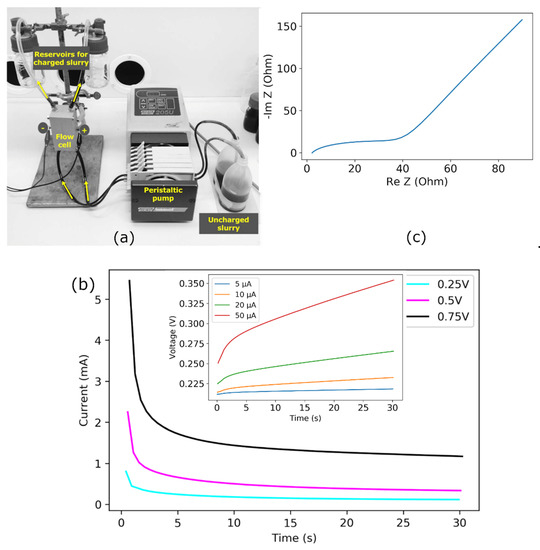 (a) Photograph of flow capacitor cell and experimental set-up for charging [49]. (b) Potentiostatic measurements at constant voltages of 0.25, 0.5, and 0.75 V and (inset) at constant currents of 5, 10, 20, and 50 µA. (c) Nyquist plot for carbon slurry in 0.1 M .