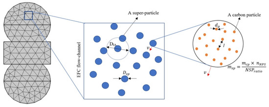 The modeling approach adopted for FE charging in EFC geometry takes the physical properties of carbon electrodes into account, such as size/shape, particle volume fraction, and concentration. Approximately 1.8 × 1017 carbon particles were in 1 cm3 of the slurry electrode. Solving the differential equations simultaneously for time, three-dimensional position, and distribution in such a dense system of nano-particles would be costly. For a more efficient simulation, the concept of a superparticle representing many real particles weakly interacting at overlapping distances was applied. The building block of the model is not of single particles but rather of collective clouds: each computational particle (defined as a superparticle) represents a group of particles that can be visualized as a small piece of phase space. This particle-based model was developed to study the dense particle concentration by following each particle’s trajectory using Newton’s law of motion [51]. In addition, this method allows the rescaling of the number of particles because the Lorentz force’s acceleration depends only on the charge-to-mass ratio so that each superparticle follows the same trajectory as a real carbon particle. The SP diameter should be smaller than the width of the flow channel and several orders larger than the size of carbon particles. Figure 3 shows the main idea, depicting the lumping of several real particles into a distribution of superparticles. Due to stochastic nature of the model, the main advantage of such an approach is its capacity to add arbitrary random and fluctuating side reactions or forces to the simulation.