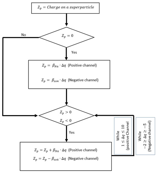 The variable is the initial charge on the SP, and is the charge difference before and after the charge transfer to the SP. Since the initial SP release in the flow channel is random and diffuse scattering randomly interacts with other SPs, the charge transfer is also considered random. If the average number of positive ions to adsorb to the carbon is , then the number of negative ions that adsorb to the carbon is , following the charge neutrality. Each SP redistributes its charge to the neighboring SP within the interaction diameter , conserving the total charge [56]. This recurring charge transfer over time is calculated by a state variable , given as