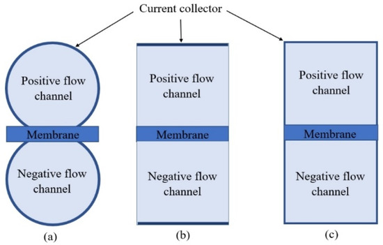 Model geometry design with two channels separated by a membrane. (a) Circular channel, (b) box-shaped with the linear current collector, and (c) box-shaped with the extended current collector.