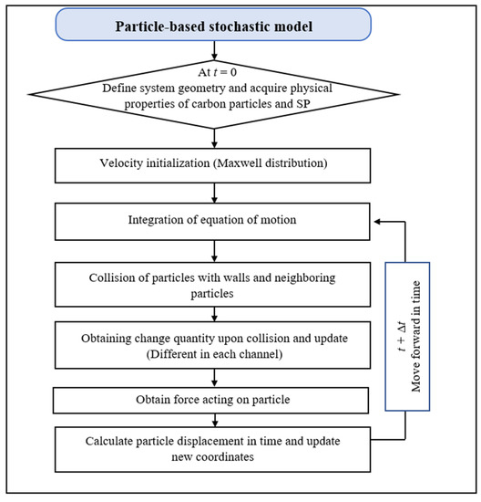 The proposed numerical simulation method was implemented in COMSOL Multiphysics 5.5 and developed based on finite element analysis and Newtonian particle dynamics. Figure 6 shows the schematic loop diagram of the numerical solution procedure of the developed method. The velocities of particles are initialized by Maxwell distribution at the first time step of the simulation—in the following steps, Newton’s equations are solved to obtain particle movement This loop is carried through all the particles individually at each time increment. To calculate the charge quantity, the loop is also performed on all the contact SPs within the interaction range.