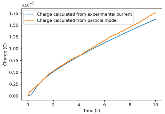 The particle-based model presented in Section 3 is validated using experimental measurements from Section 2. The model allows calculating the total charge in the flow channel, while the total charge in the experimental study is evaluated by integrating the current at the constant voltage of 0.75 V. This validation of the particle charging model includes the optimization of the critical modeling parameters and testing its sensitivity for the charging progress.
