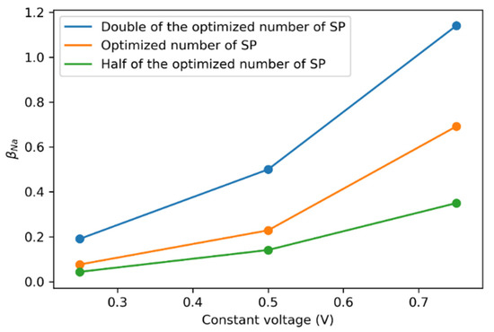 After the optimization, the flow channel contained 4031 superparticles, and for each carbon particle in an SP, 0.69154 positive ions were present for double-layer charging. Increasing the number of SPs would decrease the mass of the individual SP, facilitating efficient movement. Hence, more collisions could improve the charging of electrodes over time. Doubling the SPs also doubled the availability of positive ions for the charging process (Figure 8). This change in ion availability was much more prominent at higher voltages, supporting better carbon electrode utilization. The change in showed an almost linear relationship with increasing constant voltage, suggesting that only double-layer charging would be expected in a circular flow channel.