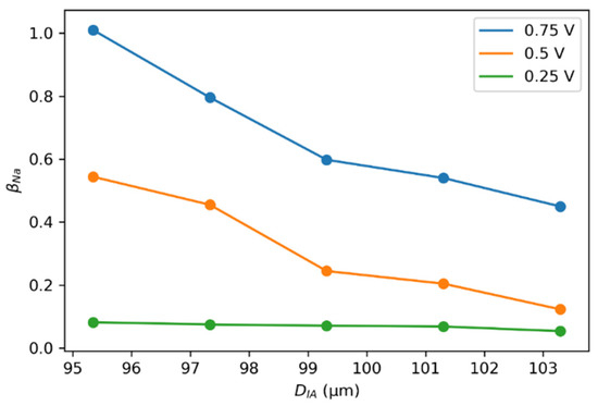 The SP size was kept constant at the optimized value of . The change in when changing the interaction diameter by ±2 and 4% from the optimized value is illustrated in Figure 9. When the interaction diameter was less than the SP size, the increased because of the fewer scattering possibilities for other SPs. The numerical analysis showed that the relationship between SPs was asymptotic at the increased interaction distance. In contrast, for the interaction distance comparable to the size of SP, the interaction was most effective for the homogenous charging of the semi-solid electrode in the flow channel [62]. The change in at the lower voltages was almost negligible, yielding unproductive operating conditions. The utilization of carbon and charging productivity improved at the higher voltages, resulting in the more efficient charging of slurry electrodes.