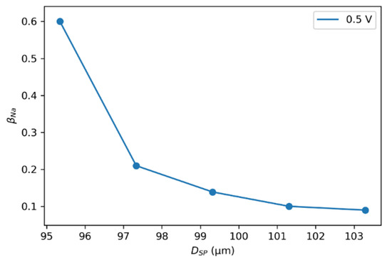 as a function of SP size with . Calculations were performed using the experimental reference data of EFC charging at a constant voltage of 0.5 V.