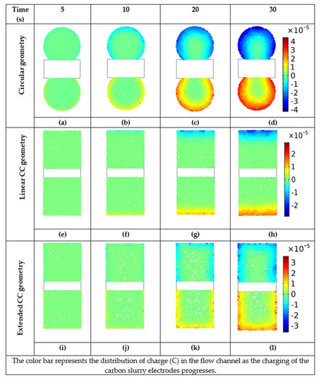 Figure 12 shows the charge distributions in the flow channel for the three geometries. The charging activity was more prominent near the CCs, leaving the central regions uncharged. The circular channel exhibited maximum charging and carbon utilization, as shown in Figure 12a–d. The charge diffusion becomes less effective for the carbon electrode in the box-shaped geometry with a linear and extended CC, slowing the rate of charging, as shown in Figure 12e–l. The progress of charging for each geometry is given in the Supplementary Materials: Figure S1 for the circular geometry design, Figure S2 for box-shaped geometry with a linear CC, and Figure S3 for box-shaped geometry with an extended CC.