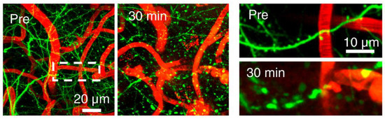 - Zhang, S.; Murphy, T.H. Imaging the impact of cortical microcirculation on synaptic structure and sensory-evoked hemodynamic responses in vivo. PLoS Biol. 2007, 5, e119. [Google Scholar] [CrossRef] [PubMed]
