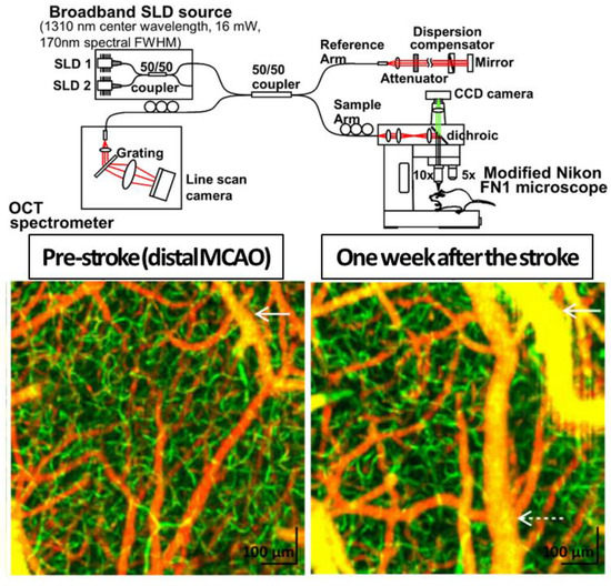 - Chen, S.; Liu, Q.; Shu, X.; Soetikno, B.; Tong, S.; Zhang, H.F. Imaging hemodynamic response after ischemic stroke in mouse cortex using visible-light optical coherence tomography. Biomed. Opt. Express 2016, 7, 3377–3389. [Google Scholar] [CrossRef]