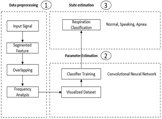 The proposed method visualizes the signal of the respiration state obtained from the UWB radar in both the time and the frequency domains and classifies the respiration state using an artificial neural network. The overall flow chart for apnea detection and respiration classification based on a convolutional neural network considering the visualization of respiration consists of three steps, as shown in Figure 3.