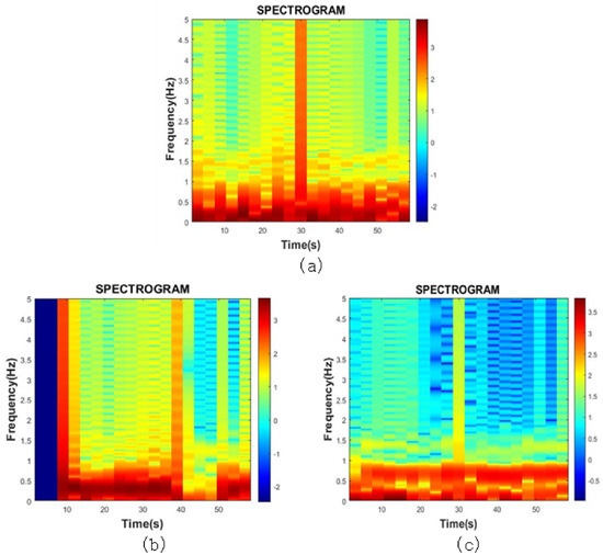 First, a visualized data set is created based on the time domain and the frequency domain through the segmentation, overlap, and frequency analysis of the respiration state signal input in the pre-processing process. Through the frequency analysis of the divided time domain, it is possible to extract features that consider both the local and global features of the respiration signal and visualize it. Second, in the parameter estimation step, learning is performed based on a training set. Finally, in the last step, the respiration state is classified as a validation set in the state estimation step. The classifier uses a CNN suitable for image classification. In the proposed method, we present the difference between the method of system transformation of the entire feature presented by previous studies and the method of feature visualization presented in this paper. The visualization of the respiratory state periodically represents the frequency change in the input respiratory state signal. The respiratory conditions used were normal breathing, apnea, and normal breathing during a speaking activity. The actual image that visualizes the characteristics of the respiration state acquired by the radar sensor for 60 s is shown in Figure 4. The difference in the visualization image can be confirmed according to the characteristics of the respiration state. The feature visualization method used a spectrogram. As shown in Figure 4, the color red represents a high level of signal power, and the color blue stands for a low level of signal power. Thus, the spectrogram shows the distribution of signal power of different frequencies.