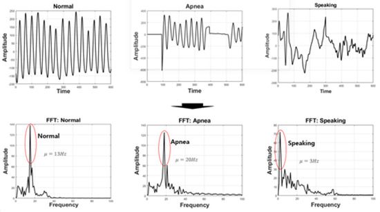 The respiration signals in the time domain used in the experiments are also represented in the frequency domain using the fast Fourier transform. As shown in Figure 5, normal respiration has a peak value of around 13 Hz, apnea has a peak of around 20 Hz, and speaking respiration has a peak of around 3 Hz. is the average frequency of respiration states in the frequency domain.