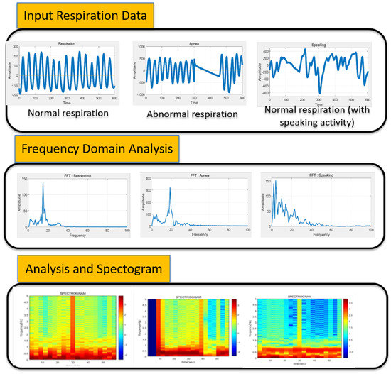 Biosignals have played an important role in the diagnosis and treatment of diseases, and they have also played a key role in preventing further severe diseases. In practical fields, wearable devices have recently been developed to diagnose cardiac fibrillation or other diseases using biosignals acquired from the human body using specific types of sensors [1]. In general, biosignals are categorized into four groups: heart rate, blood pressure, body temperature, and breathing rate. From among the four aforementioned signals, respiratory signal has gained less attention than the others. Representative biosignals are divided into two types [2]: Electrical signals generated by the human body and can be measured with an electrocardiogram (ECG), which includes the electrical activity of the heart; an electroencephalogram (EEG), which is based on the brain; and an electromyogram (EMG), based on nerves and muscles. There are also non-electrical signals in the body, which include blood flow (hematocele), temperature, and respiration rate. Among these, the respiratory status is an important factor that can represent the status of respiratory organs or related ones. It also plays an important role in carbon dioxide emission and energy generation. Respiration is divided into two phases: internal and external respiration. Internal respiration is an interaction inside the body, and external respiration occurs between the body and the external environment. There are internal respiration processes in which oxygen transfer takes place in cells through interactions within the body and the production of carbon dioxide occurs, and there are external respiration processes in which oxygen is obtained and carbon dioxide is released through interactions between the environments inside and outside the human body. Apnea causes ventilatory disorders resulting from changes in the amount of ventilation in the alveoli and airways, and it is accompanied by chronic alveolar hypoventilation, hypertension, and cardiac arrhythmias. It also increases the long-term mortality rate of patients. In fact, patients with apnea have twice the risk of developing hypertension compared to those with normal respiration activities [3].