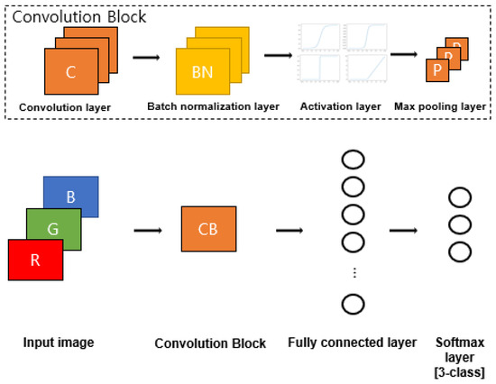The CNN analyzes and classifies visual images by applying filtering techniques to artificial neural networks. It consists of an input layer, a convolution block, a fully connected (FC) layer, and a softmax layer, as shown in Figure 7.