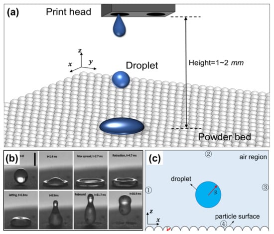 Furthermore, according to Agland et al. [45,46], when the Weber number is < 300, the droplets will spread on the surface of the powder without damaging the surface of the powder bed. Based on the comparison of the data given in Table 1, the low impulse droplet impact theory is applicable to the 3D printing scene that the droplet impacts and spreads without destroying the powder bed. The problem of micro binder droplet impact in the typical process of 3D printing can be simplified to the model of a droplet impacting on multi-particles/spheres bed/substrate, whereas in the simplified model, the powder particles were well deposited and compacted, and there is no deformation and no slip between the small particles during droplet spreading. The idealized model of binder droplets impacting the powder bed under low impact momentum is shown in Figure 2a.