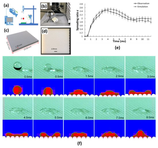 In order to test the VOF model proposed in this study, the observation experiments of millimeter-scale droplets spreading on the rigid substrate and the numerical simulations were carried out under the same conditions. What needs to be noted is that the millimeter-scale droplet is much easier to be generated and captured with common experimental equipment. The schematic diagram of test equipment is shown in Figure 3a–d.