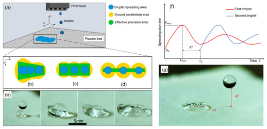 The illustration of the interaction mechanism of multiple droplets spreading. The light blue area in (a) is the binder droplet spreading area. (b–d) shows the relationship among spreading, penetration and printing precision. The light blue region was the droplet spreading area, the yellow region was the droplet penetration area, and the green region was the effective precision area of the printed sample. (e) is a captured diagram of millimeter-scale droplets to explain the droplets spreading interference. (f,g) are the schematic diagram of the spreading of two droplets. The curves of two droplets spreading behavior against time are shown in (f). (g) the photograph of droplets captured on a millimeter scale was used to explain the spreading mechanism. The is the maximum spreading time, is droplets spreading interval, is the largest spreading diameter, is the time difference between the two droplets.