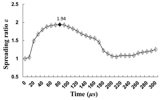 During the whole collision process, the shape of the water droplet changing at different times can be accurately reproduced by consistent simulation (see the image in Figure 3f). While comparing the experimental data with simulation results (Figure 3e), the error of maximum spreading ratio was less than 3.1%. Considering that the simulation results are based on ideal conditions, the results were acceptable. The agreements between the simulation results and the experimental data suggest that the VOF model effectively simulated the droplet impacting process.