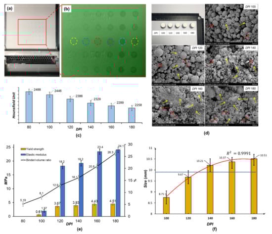 Focusing on the mechanical properties shown in Figure 6e, the powder-based samples could be saturated or oversaturated by the binder, to some extent, resulting in an increase of the mechanical performance. However, an excessive use of binder fails to improve the yield strength significantly, as shown in Figure 6e for DPI 160 and DPI 180.