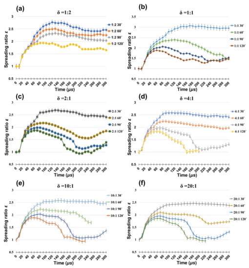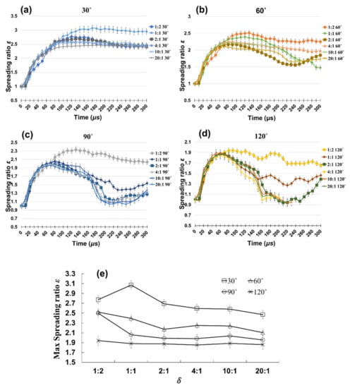 The curves of spreading ratios against time at different contact angles indicated that the contact angle has almost no effect on spreading diameters in the first 10 μs. However, when = 1:2, the difference occurs at the time of 50 μs and for ≥ 1, the difference occurs earlier at about 30 μs.