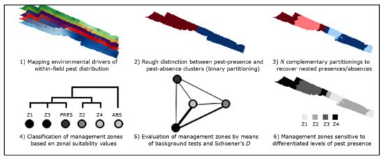 Recently, the integration of high-resolution environmental data, multivariate clustering techniques, and species distribution modeling (SDM) has led to the development of “ecological site-specific pest management” (eSSPM), an ecologically oriented approach to IPM which bases the delineation of MZ on environmentally independent sub-field units with individual potential to host pest populations [8]. SDM implements a variety of statistical mechanisms (i.e., modeling algorithms) to infer the spatial distribution of species based on correlations between their known geographic occurrences and the environmental conditions associated with them [9]. eSSPM field partitioning essays (i.e., delineation of MZ) are based on the following sequential steps: (1) description of cause-effect relationships between mapped environmental variables and within-field pest distributional patterns, (2) partitioning of a target crop field into a maximum number of MZ, (3) redefinition of MZ via SDM algorithms, (4) validation of environmental independence between MZ, and (5) classification of MZ based on their potential to host pest populations [8]. Although the prospective benefits of eSSPM are relevant and straightforward (e.g., controlled pesticide use, increase of crop value), field partition models generated by this approach are prone to show different sub-optimal results such as presence zones nested within absence clusters, presence zones insensitive to differentiated levels of pest infestation, more than one pest absence zones, and inaccurately delimitated MZ [8].