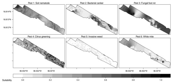 Pest 2 responded to the existence of places prone to flooding (i.e., direction of flow accumulations) and low exposition to sunlight (i.e., sun radiation), where canker-producing bacteria (i.e., Xanthomonas axonopodis) can survive for days [47,48]. Pest 3 was inspired by fungal diseases (i.e., Phytophthora sp. foot rot/brown rot) that become active during the most humid months of the year (i.e., relative humidity) [21]. The distribution of pest 4 was based on an insect-transmitted disease (i.e., citrus greening) that proliferates better on citrus trees (i.e., NDVI) already exposed to physiological stress (i.e., pH) [49]. Pest 5 mimicked a generic undesired weed that invades bare soil areas of citrus orchards (i.e., FVC) when warm microclimates occur (i.e., ambient temperature). Finally, distributional patterns of pest 6 were based on those of a phytophagous mite (i.e., white/broad mite, Polyphagotarsonemus latus) whose populations thrive on trees damaged by previous diseases (i.e., inactive Phytophthora sp. foot rot) and highly stressing environmental conditions (i.e., electrical conductivity) [21].