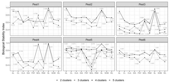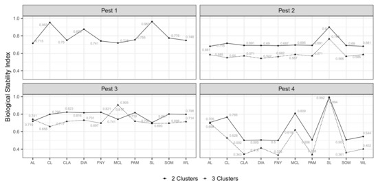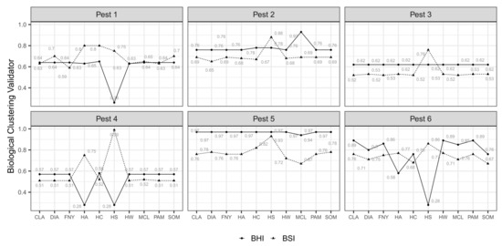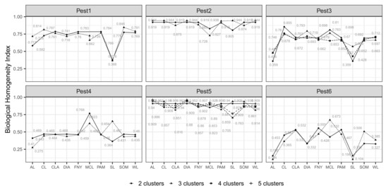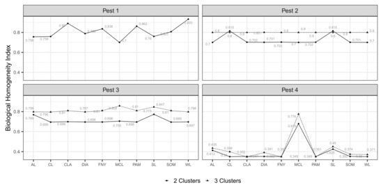 Selection of best field partition models (i.e., testing the performance of MC algorithms) and appropriate numbers of MZ were based on BHI and BSI indexes (0-1). BHI is an external measure for genetic clustering validation proposed by Datta and Datta [56] that determines how homogeneous clusters in a partition model are (higher values meaning a higher homogeneity) in terms of biologically meaningful categories called “functional classes” (i.e., genetic functions). In our case, surrogate environmental classes (e.g., high presence, low presence, pest absence) were generated by applying different suitability thresholds to distribution maps representative of the simulated pests. The specific number of presence levels and thresholds used to define them varied according to the case. The package “clValid” calculates BHI based on the following equation: