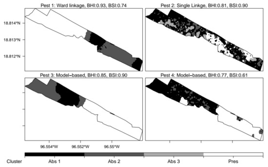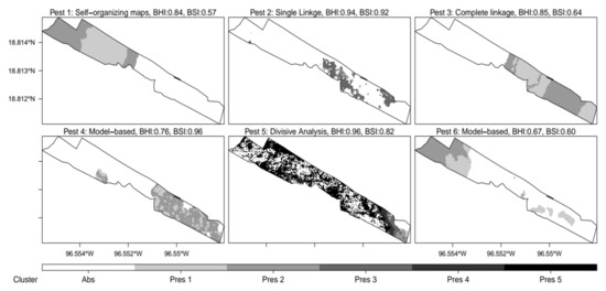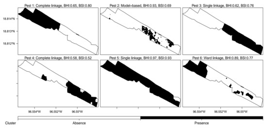 All BHI and BSI values used to evaluate binary partition models (roughly distinguish between pest presence and pest absence clusters) are presented in Figure 3. These results show that the best performing MC algorithms for pests 1 to 6 were, respectively: CL, MCL, SL, CL, SL, and WL (Figure 4). Binary field partition models that displayed BHI values approaching 1 showed excellent capability to distinguish between pest presence and pest absence zones (i.e., pest 5, pest 6). The exception to this pattern was observed in pest 2 which generated a field partition model with a BHI value of 0.93 but was unable to distinguish accurately between pest presence and pest absence zones on one half of the experimental orchard (i.e., south). It is worth noticing that the BSI value displayed by the binary partition model generated for pest 2 (i.e., 0.69) was significantly lower than BSI values observed in partition models developed for pests 5 and 6 (0.97 and 0.89 respectively).