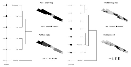Individual dendrograms were generated by hierarchically clustering (i.e., AL) environmental values representative of management zones included in a preliminary field partition model and true presence/absence zones known to operate within the experimental orchard. True presence and absence zones were delineated by selecting a presence-absence suitability threshold (PAST) for each virtual pest and reclassifying all values in their distribution models. All suitability values below the PAST established for a given pest were reclassified to 0, whereas those equal or above such a PAST were reclassified to 1. The resulting dendrograms were used to represent the existing relationships between MZ included in preliminary field partition models and the environmental closeness of such MZ to true presence/absence zones delimited for their corresponding pests.