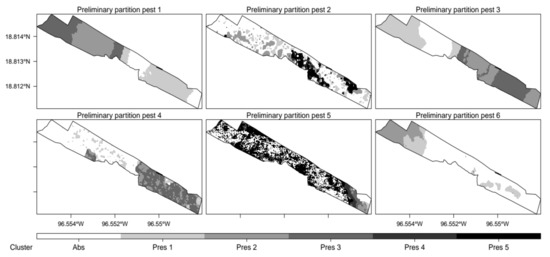 The second step consisted of complementary field partitions where 500 representations of presence-only and absence-only zones were used to implement within-cluster field partitions useful to identify differentiated levels of pest infestation and nested pest presence/absence zones. The main difference between binary and complementary field partitioning essays is that the former aims to partition the target crop field into two sub-field units (i.e., pest presence and pest absence clusters). In contrast, the latter seeks to partition binary sub-field units into several MZ that facilitate whether the “rescue” of nested presence/absence zones or the recognition of differentiated levels of pest infestation.