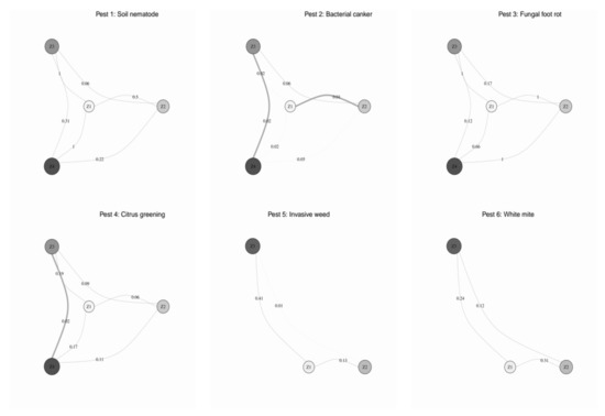 In practice, environmental and geographic samples (i.e., environmental values, geographic coordinates; n = 500) of management zones included in preliminary field partition models were used to implement pairwise background tests that generated individual matrices of between-zone overlaps (one for each pest). Such matrices were used to feed a set of visual networks that represented management zones as labeled nodes, the environmental similarity between zones as numbers next to each link (i.e., D), and the statistical significance of a particular nexus value as the link’s width. In cases where preliminary field partition models considered more than one absence zones, these were fused into a single absence cluster before MZ networks were computed.