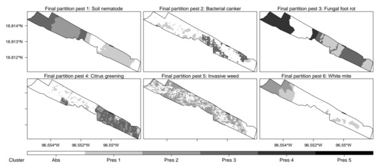 The development of this paper was based on two assumptions. First, to overcome the methodological limitations currently reported for eSSPM, field partitioning essays should consist of a two-steps process (i.e., nested field partitioning) where a rough distinction between pest presence and pest absence zones (i.e., binary field partitioning) precedes the subdivision of resulting sub-field units (i.e., complementary field partitioning). Second, external validation of eSSPM field partitioning essays based on biologically interpretable CVI should facilitate the selection of optimal MC algorithms to be used and appropriate numbers of MZ to be delineated. To prove these statements: (1) we used high-resolution environmental data from a Tahiti lime orchard and realistic simulations of six common citrus pests to generate a series of virtual infestation scenarios suitable for methodological testing purposes; (2) we implemented a series of nested field partitioning essays to test their capability to minimize sub-optimal zoning results reported for current eSSPM methods, and (3) we used two biologically meaningful CVI to compare the performance of 10 MC algorithms and to determine appropriate numbers of MZ to be considered during field partitioning essays. The use of simulated pest data allowed the development of testing essays under controlled virtual scenarios, an advised condition to assess modeling methodologies in ecology since it grants researchers unrestricted access to statistical processes and evidence necessary for drawing robust conclusions about natural mechanisms [12,13,14].