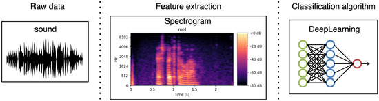 Pipeline of a basic procedure in audio classification problems. First, raw data are identified, i.e., the wav audio itself. Then, the characteristics are extracted with a tool, the spectrogram, through librosa [58], in this case. Finally, the classification problem is carried out, in this case, using neural networks. Color in Deep Learning diagram means input, intermediate and output layers.
