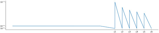 In the training process, several decisions were made. On the one hand, all samples were padded to obtain the same time dimension, as mentioned above. Thus, the training process is easier when all of the batches have the same input length. On the other hand, an ADAM optimizer with stochastic weight averaging (SWA) [65] procedure was used as the optimization method. SWA can be used with a learning rate schedule that encourages exploration of the flat region of solutions. To this end, a cyclical learning rate schedule was used (see Figure 4). First, 60,000 batch updates were performed with a constant learning rate of . Second, a decaying schedule with a learning rate of over 1000 batch updates was applied. Finally, cyclical learning rates were adopted over five cycles, with a decaying learning rate schedule from to . The models for averaging were collected at the end of each cycle, corresponding to the lowest values of the learning rate.