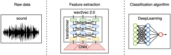 Pipeline for emotion detection from audio signals using wav2vec 2.0 [41]. First, raw data must be identified, i.e., the wav audio itself. Then, the characteristics are extracted with the pretrained wav2vec model, and finally, the classification problem is carried out, in this case, using neural networks. Colors in Deep Neural Networks means different type layers.