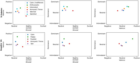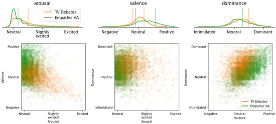 As mentioned above, all of the samples were considered for the VAD model. Figure 6 shows the probability density function of each variable (valence, arousal, and dominance) that was obtained by a Gaussian kernel density estimator (upper row). Figure 6 also shows different 2D projections of the sample distribution in the 3D space (row below), representing each scenario in a different color. When regarding arousal, the Empathic VA dataset works in a very neutral scenario, where excitement is almost absent. In TV debates, although neutrality is also predominant, some excitement is perceived due to the nature of debates. The distribution of valence also shows a clear deviation towards positive values for the Empathic VA scenario, which is an indicator of the good acceptance of the system among users, whereas in TV debates, neutrality is predominant, with only a slight nuance towards positiveness. On the contrary, dominance is shifted towards dominant values in TV debates but remains neutral when users interact with the Empathic VA case. These results correlate well with the types of audio we deal with in the two scenarios. In the TV debates, people express themselves without becoming angry (low levels of excitement) but in a very assertive way (quite high dominance levels). Additionally, they appear to be neutral when communicating their opinions (valence tends to be neutral or slightly positive). In the Empathic VA scenario, the users are volunteers with a good predisposition and seem to be pleased with the system (positive valence values). They are relaxed while talking to the agent (levels of excitement tend toward neutrality) and are not intimidated (dominance values are around neutrality, with a slight shift to the right). The differences between human–human and human–machine interactions are also noticeable in the specific tasks we are dealing with. Human–human communication appears to be more intense and emotional, with higher arousal and dominance values. During communication with a machine, on the contrary, people are not confident and they tend to be expectant, which might be translated into low values of arousal/dominance and higher values of valence.